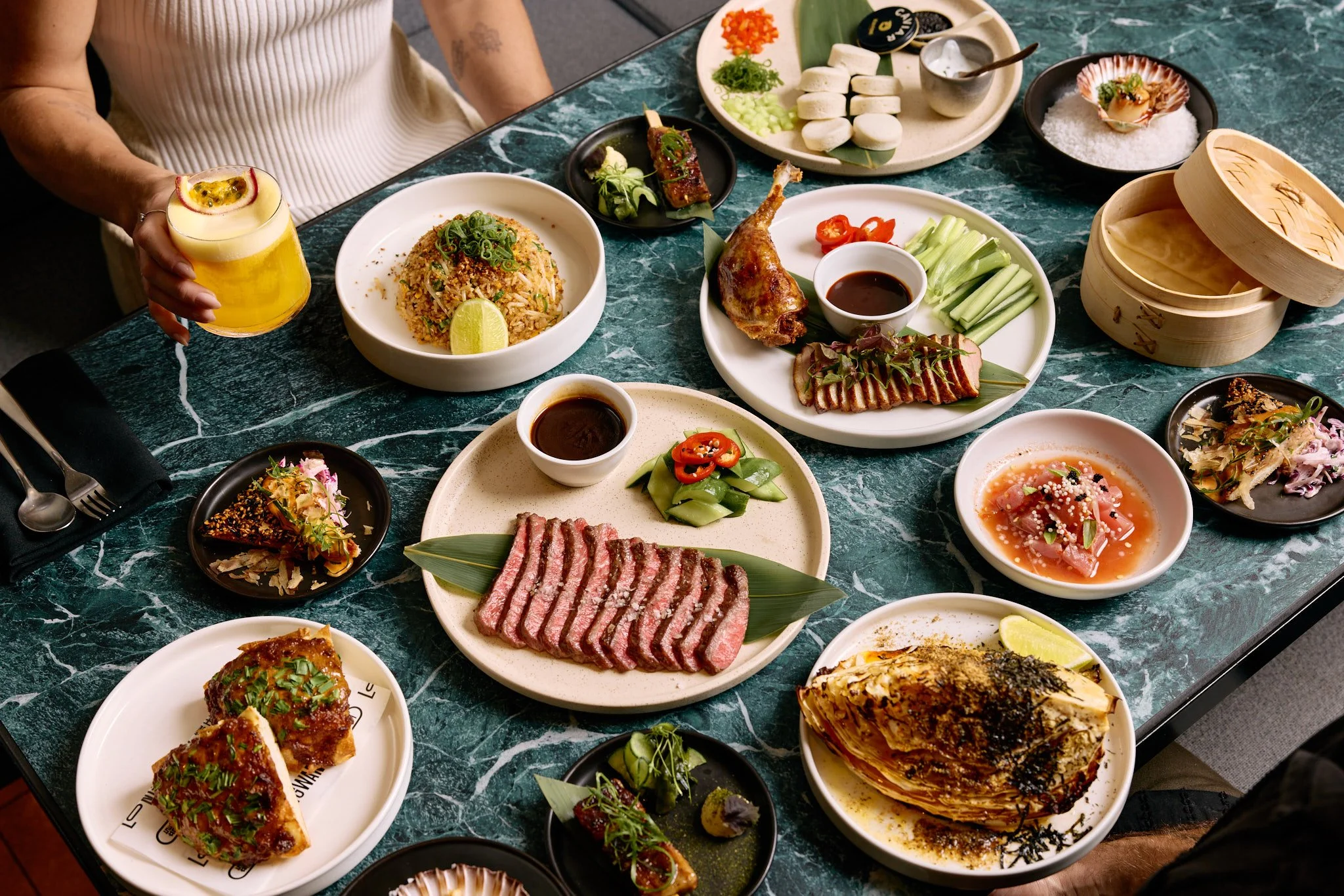 tea smoked duck breast and double cooked duck leg hoisin, plum and sriracha sauce, pancakes